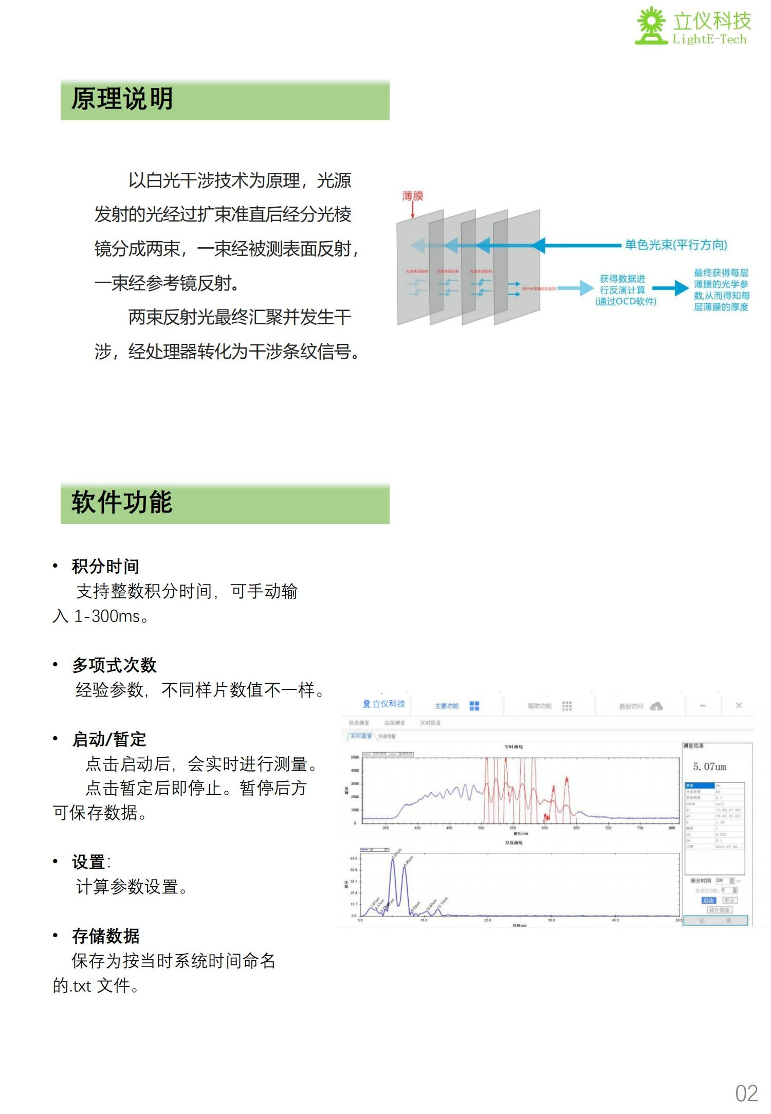 該產(chǎn)品由膜厚儀主機(jī)、上位機(jī) PC 軟件、光纖組成。用一束準(zhǔn)單色平行光照射多層薄膜, 光波會(huì)在第 1 到 n 層之間來回多次折射、反射進(jìn)而形成多個(gè)相干光束。這些相干光束進(jìn)行相 干疊加后,攜帶多層薄膜的相干信號(hào)并沿原路返回。不同波長的準(zhǔn)單色光照射薄膜后,攜帶 的干涉信號(hào)不一樣。如果用一束含有多種波長的準(zhǔn)單色光照射薄膜后,提取各個(gè)波段的干涉 信號(hào),通過 OCD 自主知識(shí)產(chǎn)權(quán)的算法進(jìn)行反演計(jì)算,便可獲得每一層薄膜材料的光學(xué)參數(shù) (厚度、折射率、消光系數(shù))。