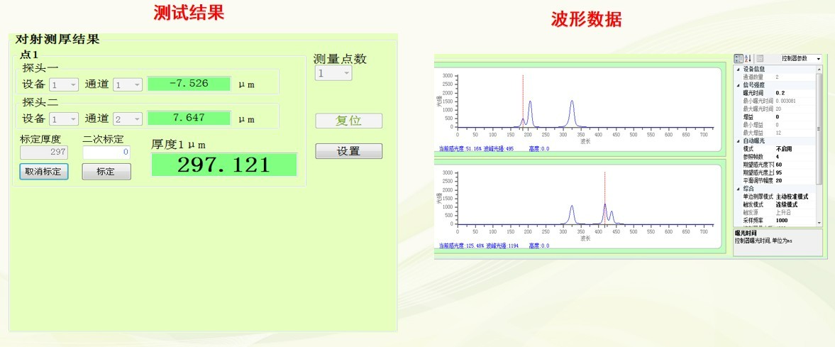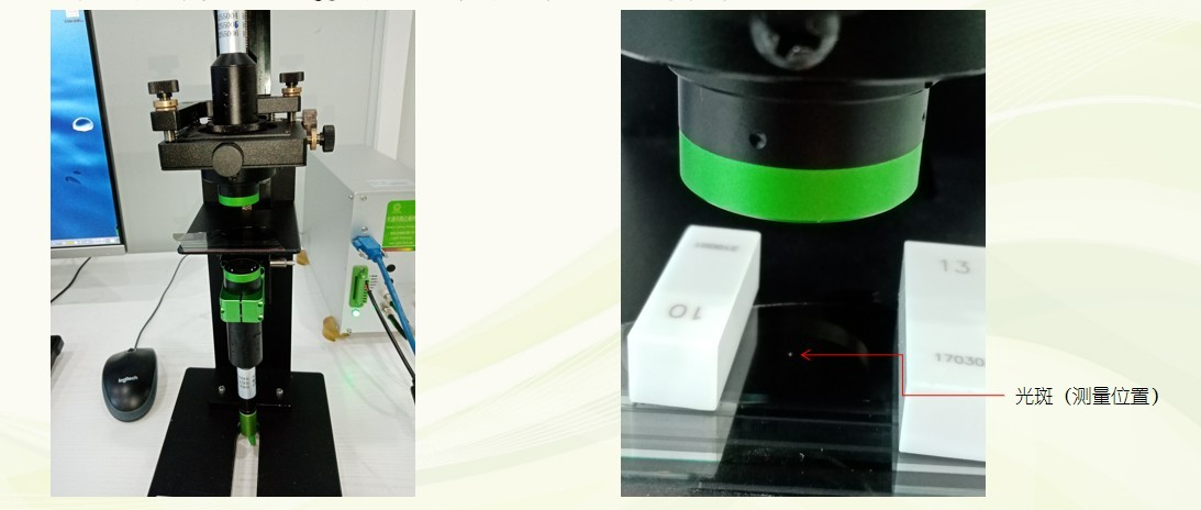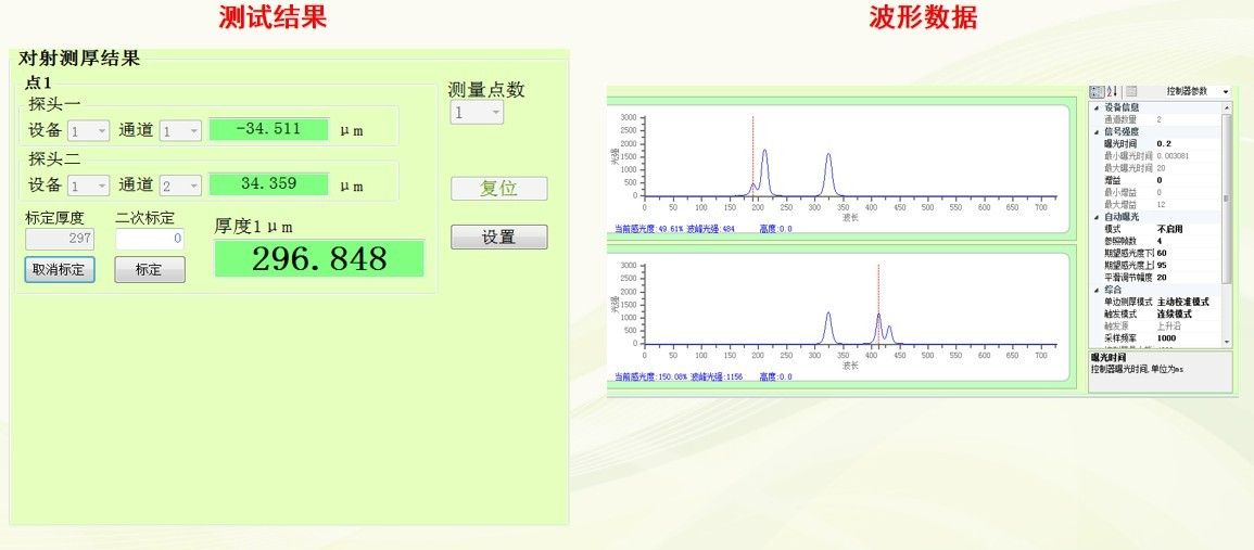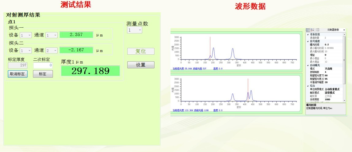 2、檢測(cè)方式:將產(chǎn)品平置于對(duì)射平臺(tái)上方,采用對(duì)射測(cè)厚模式,先將實(shí)際樣品通過(guò)接觸式測(cè)量出厚度值用來(lái)標(biāo)定,再通過(guò)傳感器軟件測(cè)量樣品其他指定位置的厚度。