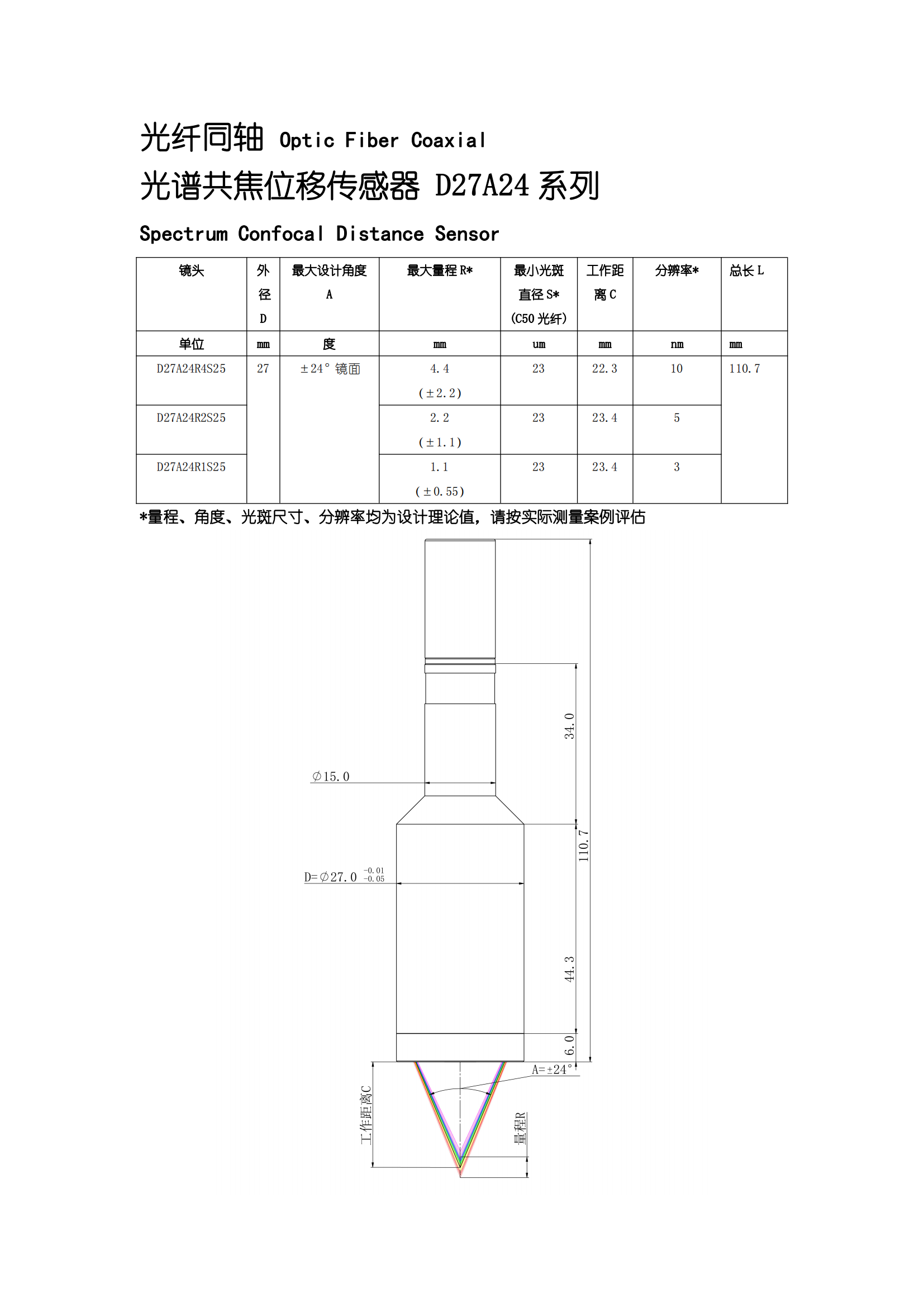 鏡頭:外徑D最大設(shè)計角度A最大量程R *最小光斑直徑S*(C50光纖)工作距離C分辨率 *總長L單位mm D27A24系列:直徑27mm,角度±24°
